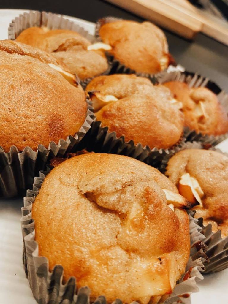 Dans un autre bol, fouettez les oeufs, le beurre et le lait. Rassemblez les deux et mélangez jusqu’à obtention d’une pâte bien homogène. Rajouter en dernier les dés de pommes (ne mélangez pas trop après l’insertion de celles ci, vous risqueriez de faire de la compote 😅)