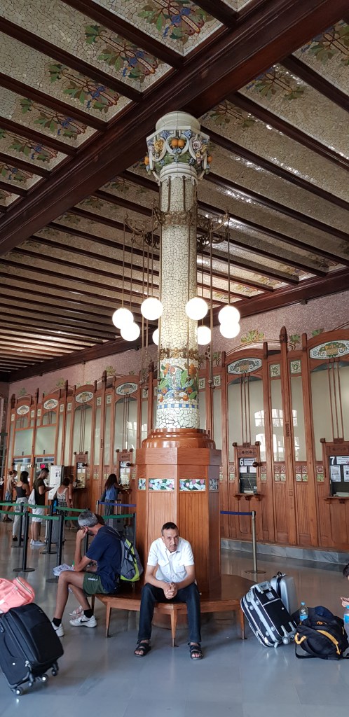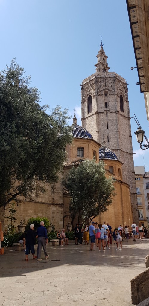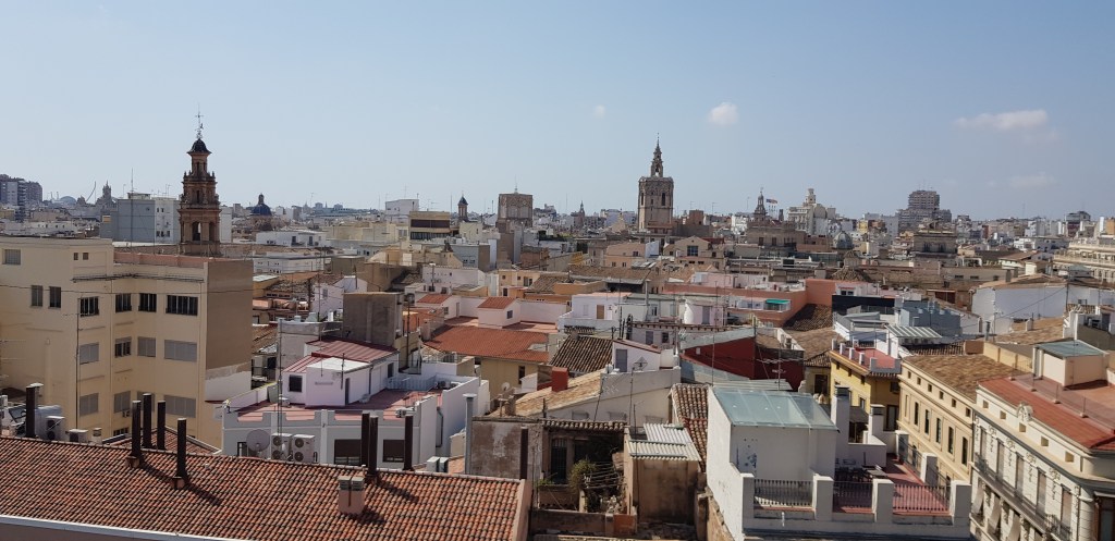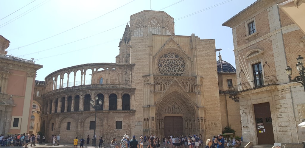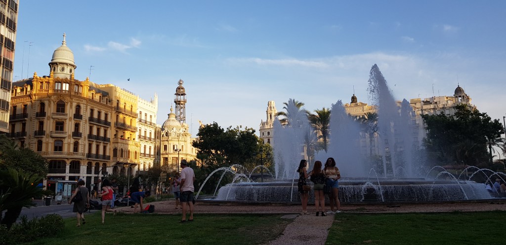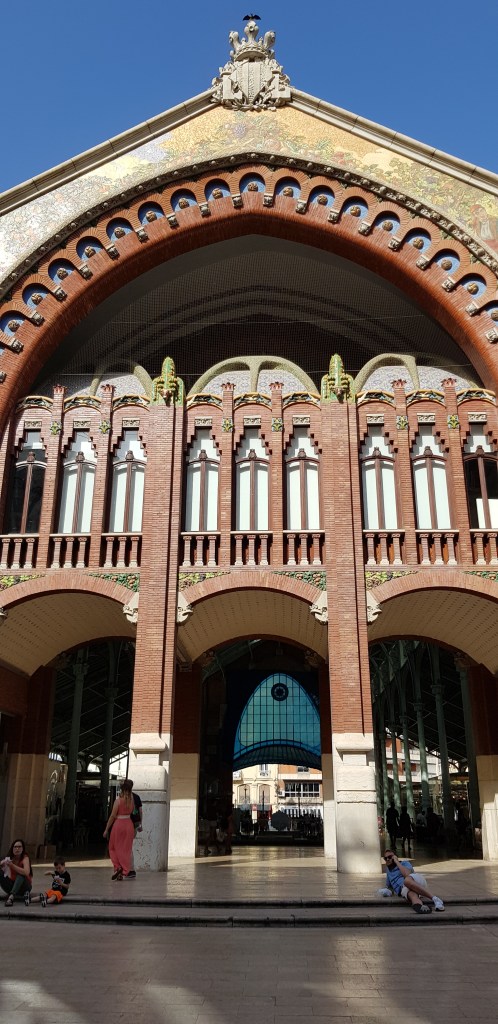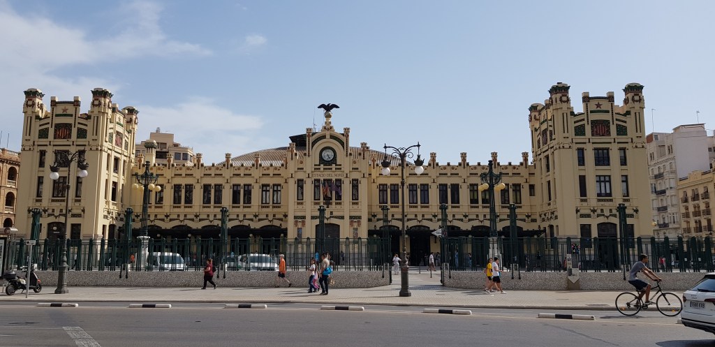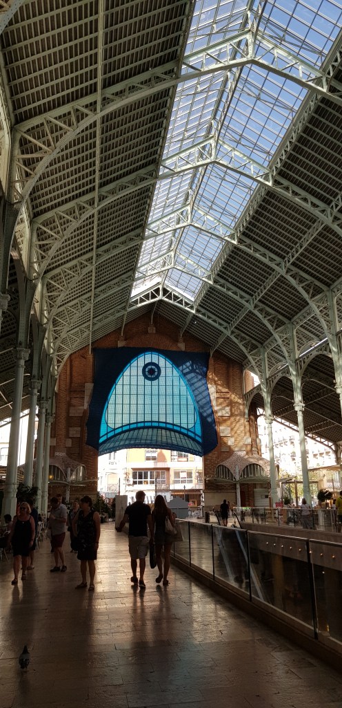 C’est parti! Vu qu’il faut bien commencer quelque part, je me dirige vers la Plaza del Ayuntamiento. Très grande place où vous pourrez observer l’hôtel de ville, la Poste centrale ainsi que la fontaine omniprésente dans ce décor (revenez par ici le soir, les éclairages sont vraiment jolis!). Passage par la Gare du Nord (rentrez dans le hall pour admirer les mosaïques) puis devant l’arène (Plaza de Toros). Etant contre la corrida, je n’ai pas voulu payer l’entrée pour subventionner ce genre de pratique (bien que pour 2€, ce n’est pas moi qui financerait un show, mais tout de même, c’est par principe) mais cela reste un très beau bâtiment, même juste de l’extérieur. Sous une chaleur accablante, petite pause smoothie au Mercado Colon, un magnifique bâtiment composée d’une charpente métallique recouverte de verre. Le résultat est incroyable !