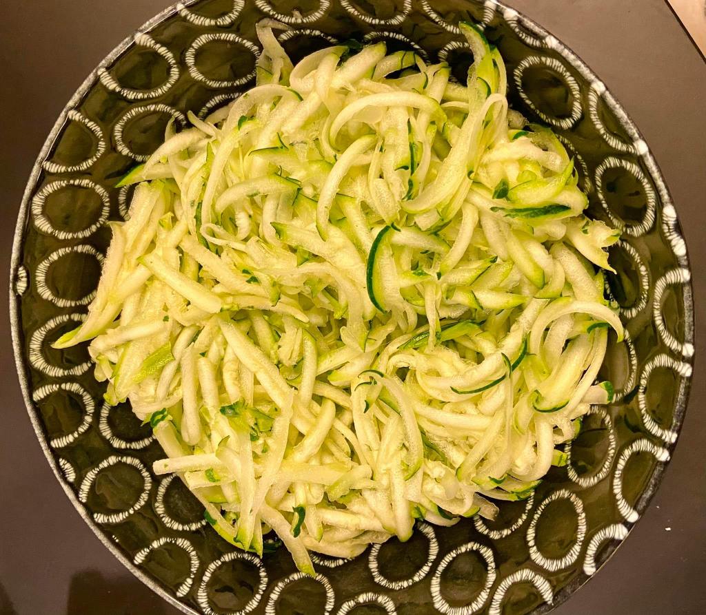 Râpez les 3 courgettes puis incorporez les à la préparation verte.