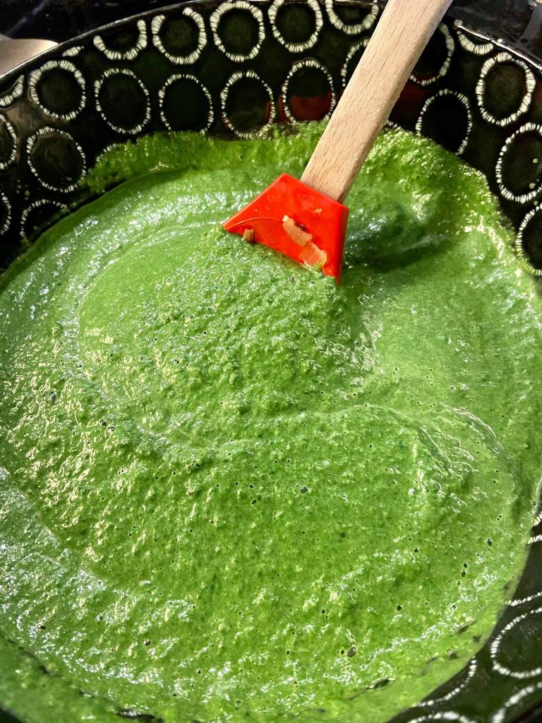 Dans un blender (ou avec un mixeur), mixez ensemble le poivron vert ainsi que les épinards et son jus. Ajoutez le chèvre frais.