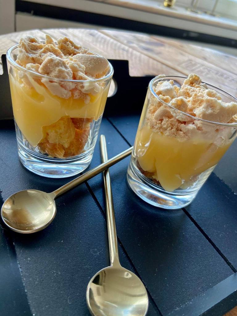 Au dessus, ajoutez une grosse couche de Lemon curd. Et enfin terminez par des brisures de meringues.