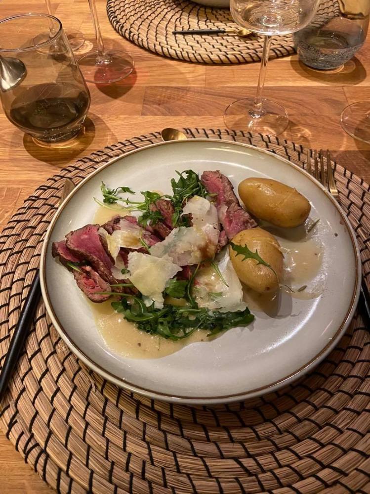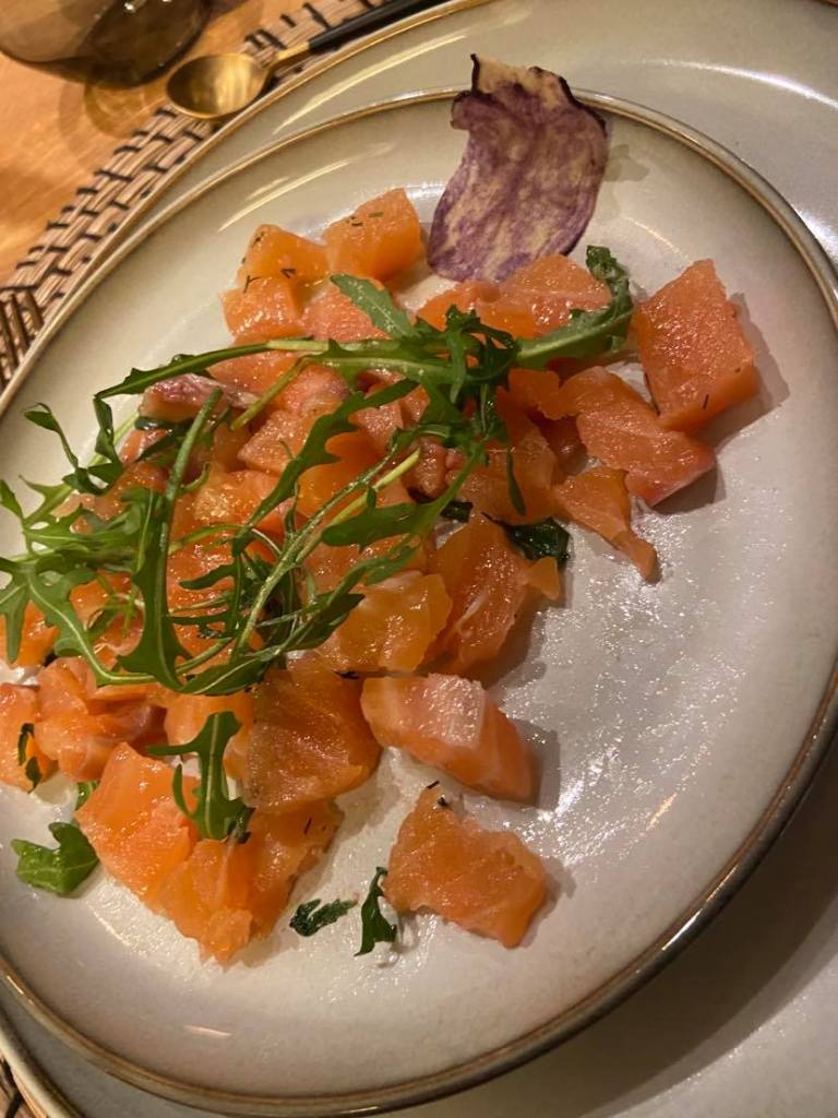 Pour lui, un morceau de saumon cru à couper. A mon grand étonnement nous devions nous même couper le gravlax. Le saumon était de très bonne qualité et l’ensemble était très bon mais pour moi le gravlax doit être coupé fin, et nous n’avons ni les ustensiles ni les compétences pour le faire. Il a donc mangé un tartare de saumon …