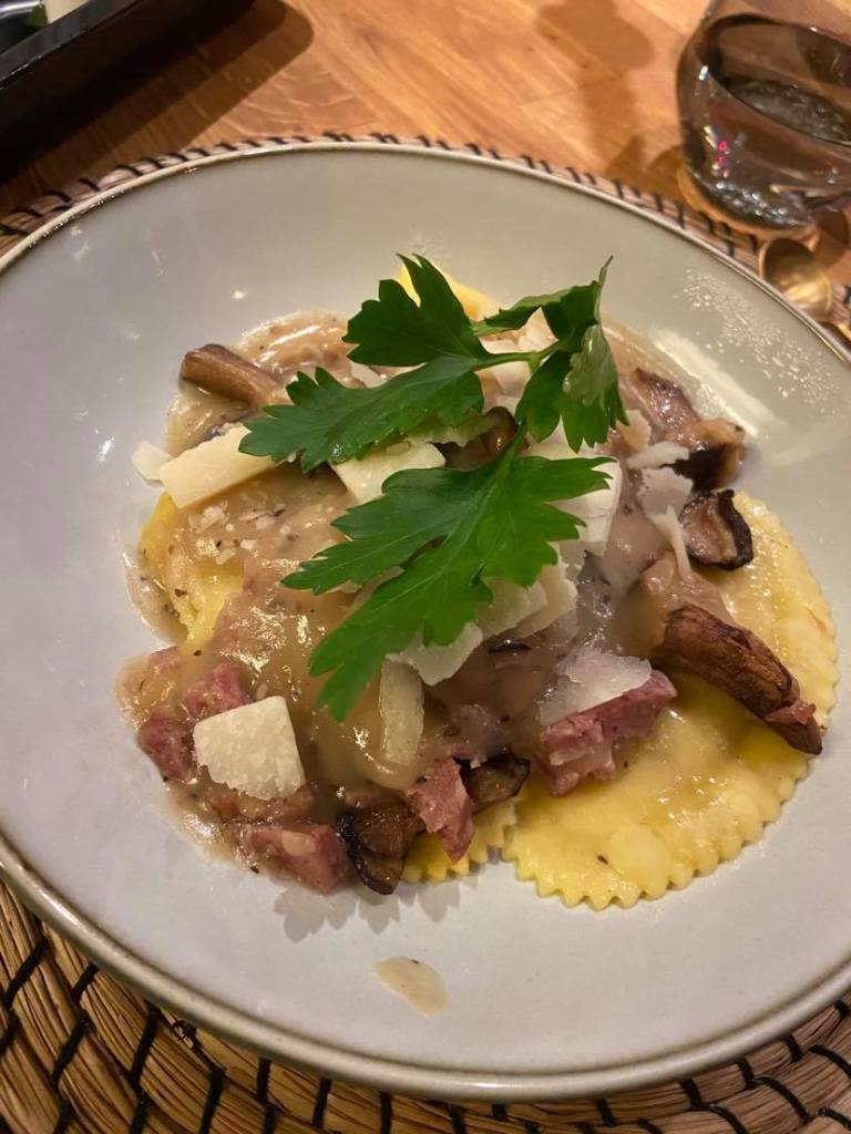 Lui : Ravioles aux champignons des bois et saucisse